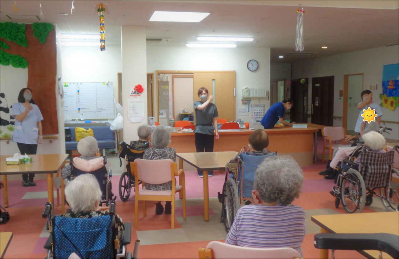 毎日、午前中の活動のうちの一つに体操を行っています! 内容はラジオ体操と指先などの細かいところを動かす体操をします。 利用者様が元気いっぱいの秘訣はこの体操にあるのかもしれません^^ ![]() 無理のない範囲で身体を動かしていただいて、本日の体操も誰一人怪我なく 終了です~ お疲れさまでした!! ![]() 事務