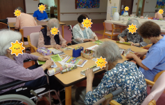 先日、夏の壁画が完成しましたが今度は秋に向けての制作が始まりました!! 前の記事で予告したものですね!まだ夏の壁画制作の記事を読んでいない方は出来上がりが素敵なので、そちらから読んでいただけると嬉しいです^^ 今回は広告をくるくる丸めて棒状にしているようですね~ ![]() ![]() 男性グループも一緒にくるくる~っと ![]() 今作っていただいているものが何になっていくのか続きも書いていくので、皆さん想像しながら読んでみてくださいね! 事務 |