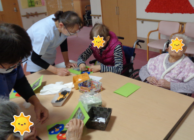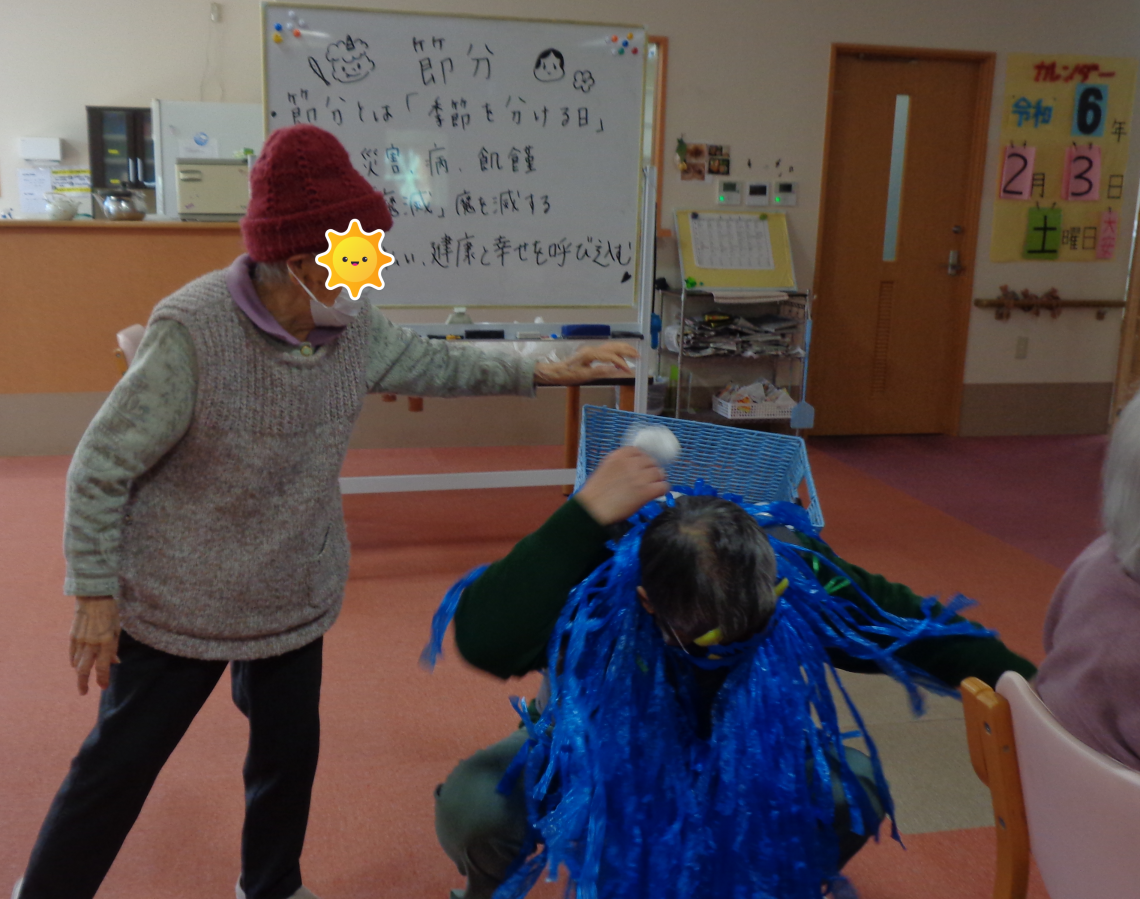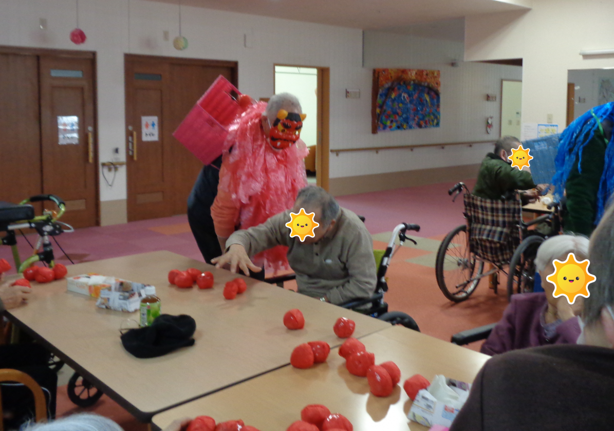 今日は節分という事で、しんせいでも豆まきを行いました~ ※豆撒きは豆を使用すると、スタッフの目が届かないところで食べて喉に詰まらせて しまう恐れがあるので、ボールで代用して行いました^^ まずは、節分の説明と始まりの挨拶をして頂きました。 節分は必ずしも2月3日ではないそうです 立春の日付が動く場合は節分の日付も動くそうですよ~ 因みに… 2024年~2027年の節分に日にちはこのようになっているそうです 2024年……2月3日 2025年……2月2日 2026年……2月3日 2027年……2月3日 豆まき 鬼役はセンター長と副センター長にお願いしました~ 赤鬼はセンター長 ![]() ![]() 青鬼は副センター長 ![]() ![]() その後、カード作りという事で、皆さん楽しみながら取り組まれていました! 節分の壁画の前で写真を撮り、その写真とスタッフが折り紙で作成した鬼の顔を色画用紙に貼ってお渡ししました^^ 鬼の顔のパーツは利用者様に貼っていただき、オリジナルのカードが出来上がりましたよ! ![]() ![]() ![]() 昼食は行事食でした^^ ![]() 今回の行事もみなさん楽しんで参加されていました~ 次はどんな行事を行うのか、お楽しみに!! 事務 |
