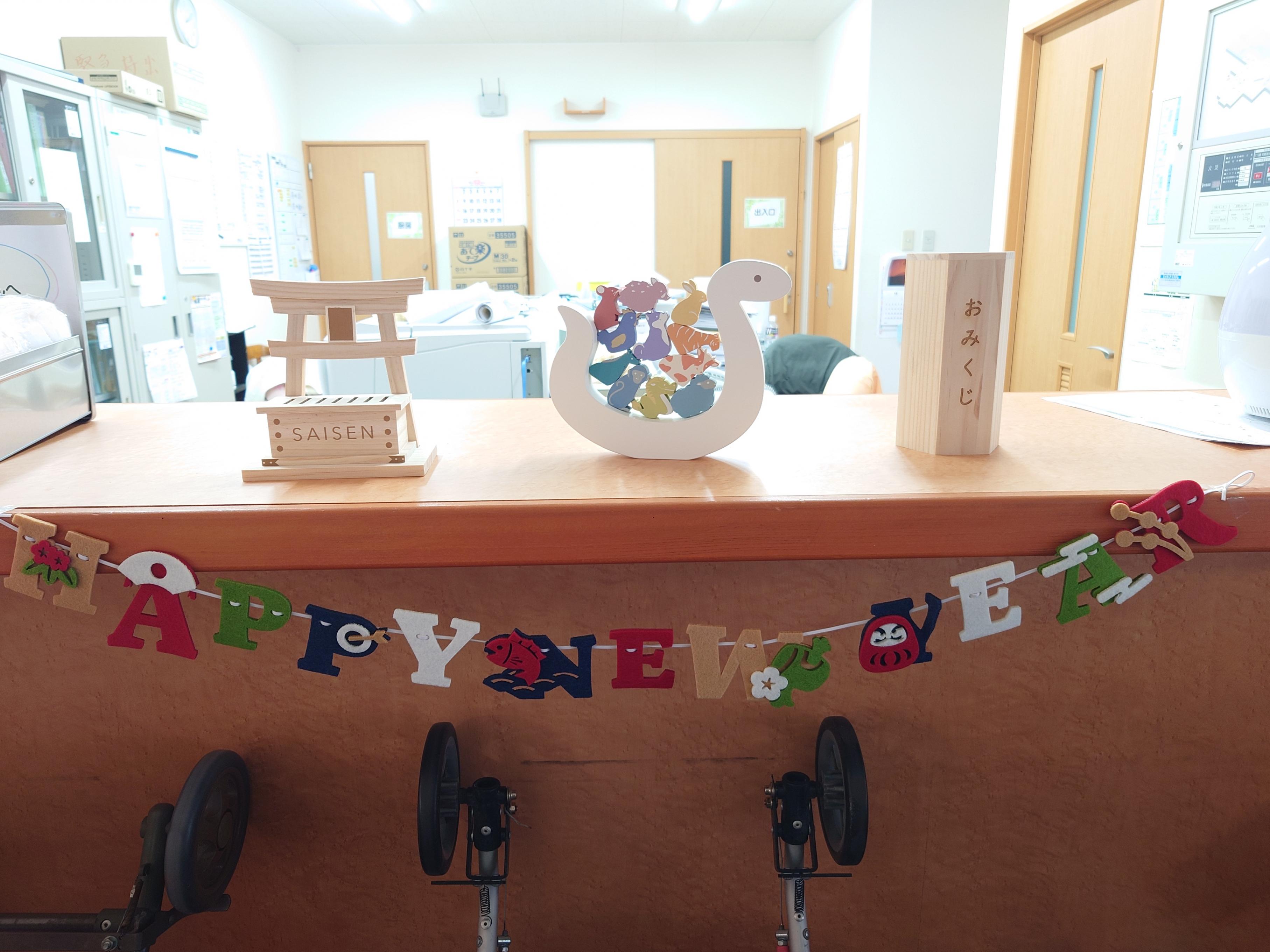 事務所のカウンターもクリスマスが終わり、正月飾りをしました~ 玄関の飾りつけはまた後日書いていこうと思います! おみくじを飾ったので、お正月には利用者・職員のみなさんに引いてもらう 予定です^^ 新しい1年の初めに運試しですよ~ ![]() 干支の飾りは巳の上に他の干支の動物が乗っているデザインになっています^^ シンプルだけどかわいらしい飾りつけになったと思います~ 事務 |