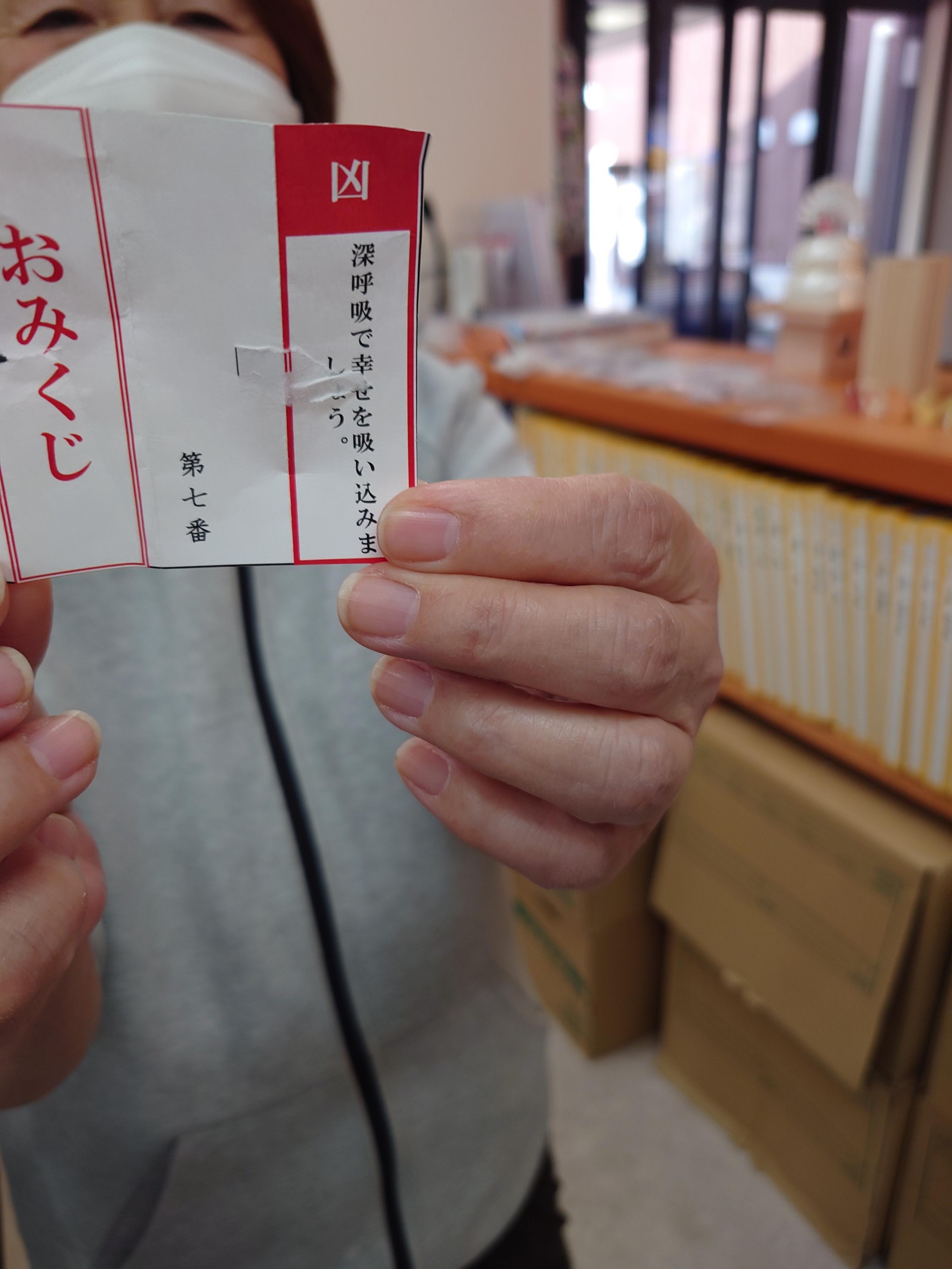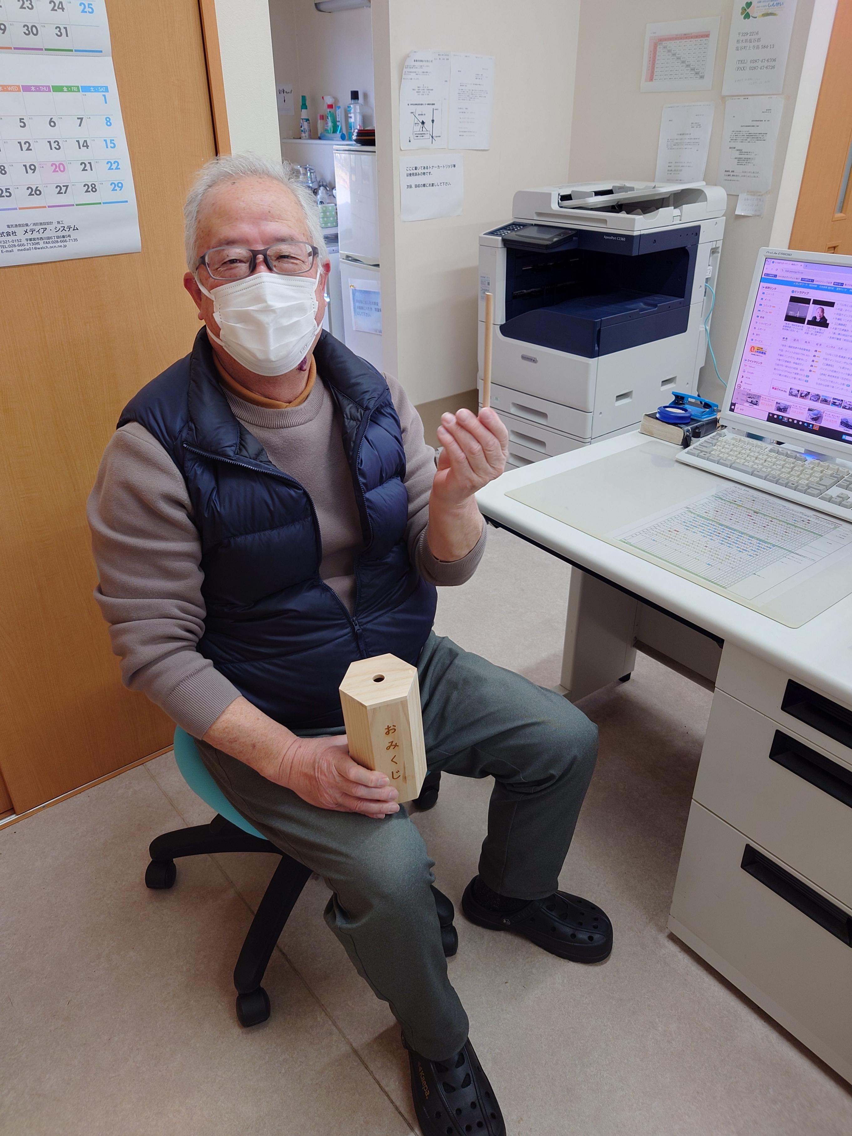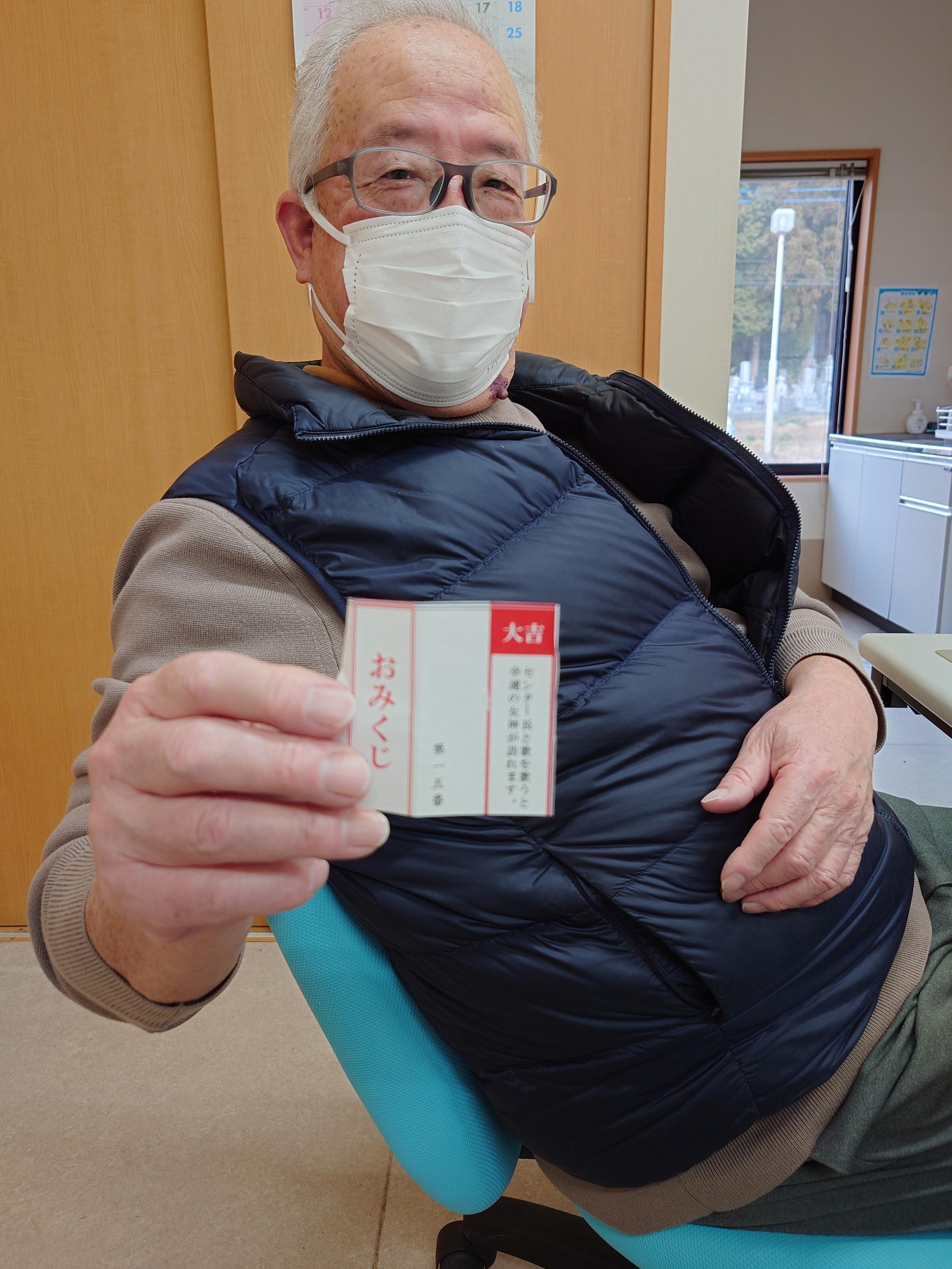 ご挨拶が遅れてしまいましたが… 明けましておめでとうございます。本年もよろしくお願い致します。 さて、お正月という事で利用者の皆さんには絵馬を書いていただきましたよ^^ みなさんの願いが叶うといいですね! ![]() 利用者さんに引いていただいたおみくじを スタッフも運試しという事で引いてみました~ 一生懸命フリフリするセンター長… ![]() 出ました! 果たして結果は… ![]() 大吉が出ました~ 流石、年男のセンター長~ ![]() 相談員さんもおみくじを引いてみました^^ 引いた結果は…もう表情が物語っているような… ![]() 凶…でした おみくじに書いてあるように、深呼吸で幸せを吸い込んでほしいですね… ![]() 初めてやってみましたが、わいわいと楽しめたのではないでしょうか? これを毎年の恒例にしていけたらいいなぁと思います^^ 事務 |