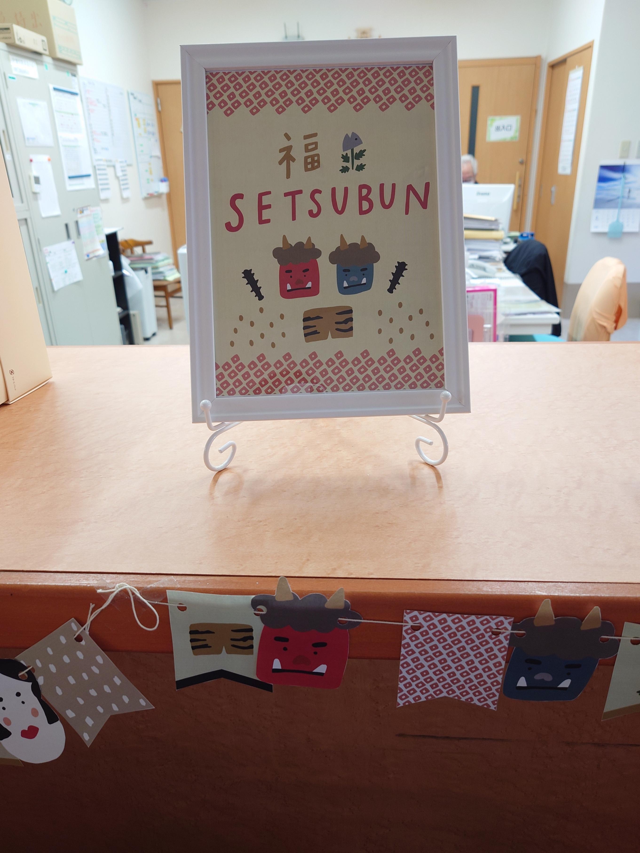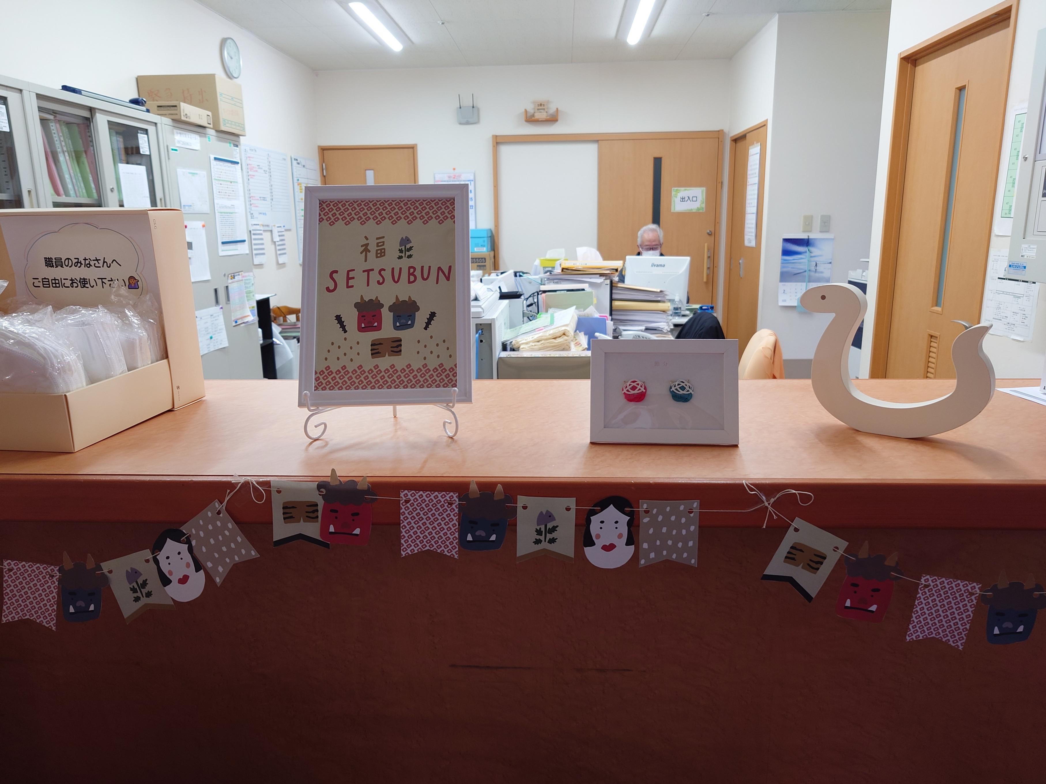 前回は玄関の飾りつけについてでしたが、今回は事務所カウンターの飾りつけを 紹介します^^ 節分にちなんだガーランドとちょっとしたポスター、水引で作った赤鬼と青鬼を 飾ってみました~ 全体はこんな感じになりました ![]() かわいらしいポスターを見つけたので飾ってみました! ガーランドも良い感じです~ ![]() 水引で作ってみました^^ ![]() 事務 |