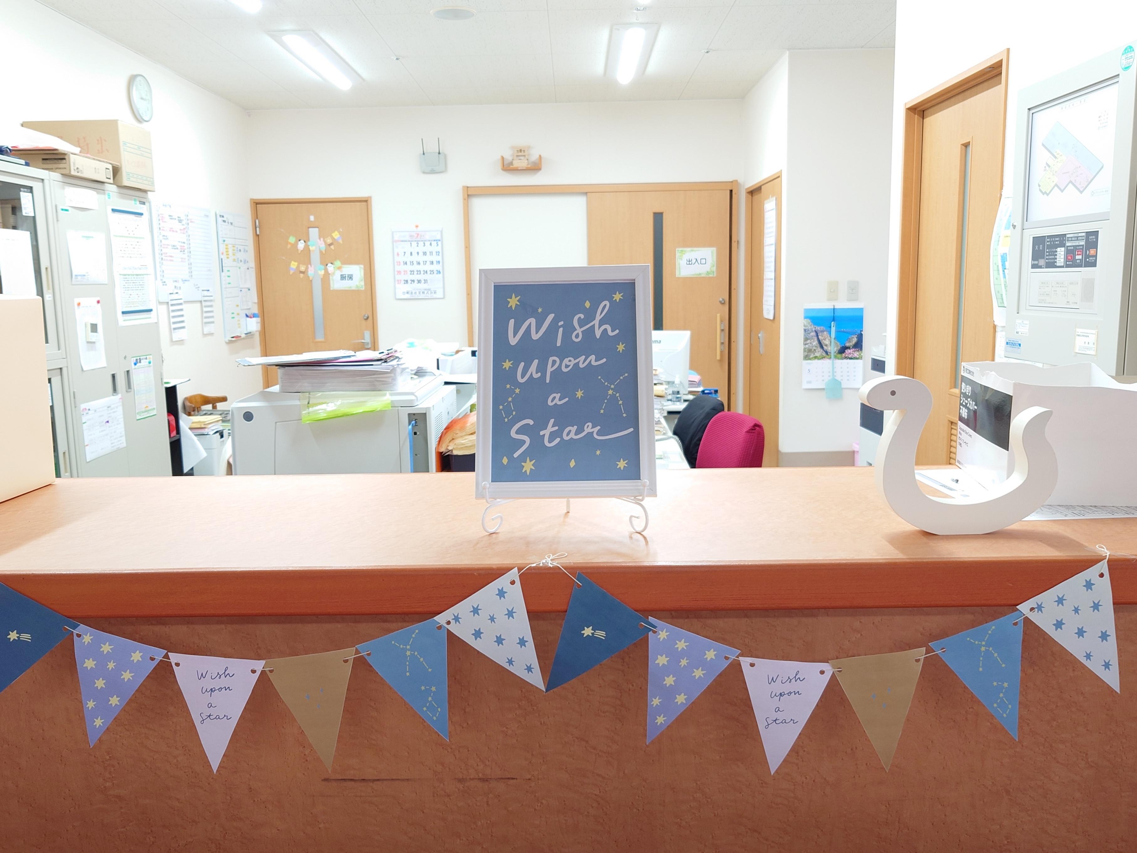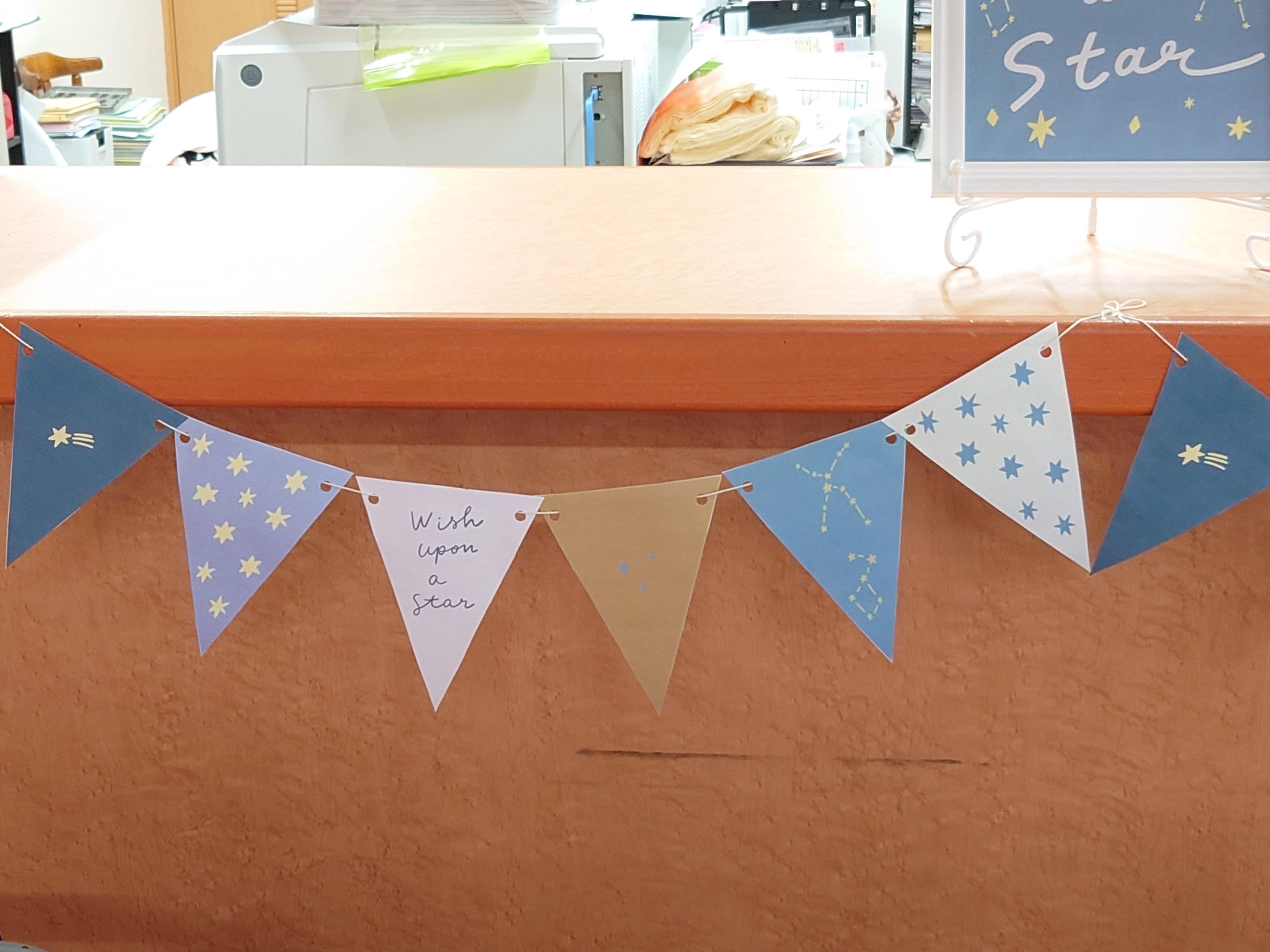 7月は七夕があるので、七夕をイメージした飾りつけにしました~ ![]() ポスターは日本語で星に願いをという意味です 短冊に書いたみなさんの願いが叶うといいですね^^ ![]() ガーランドは星柄です~ ![]() 事務 |
