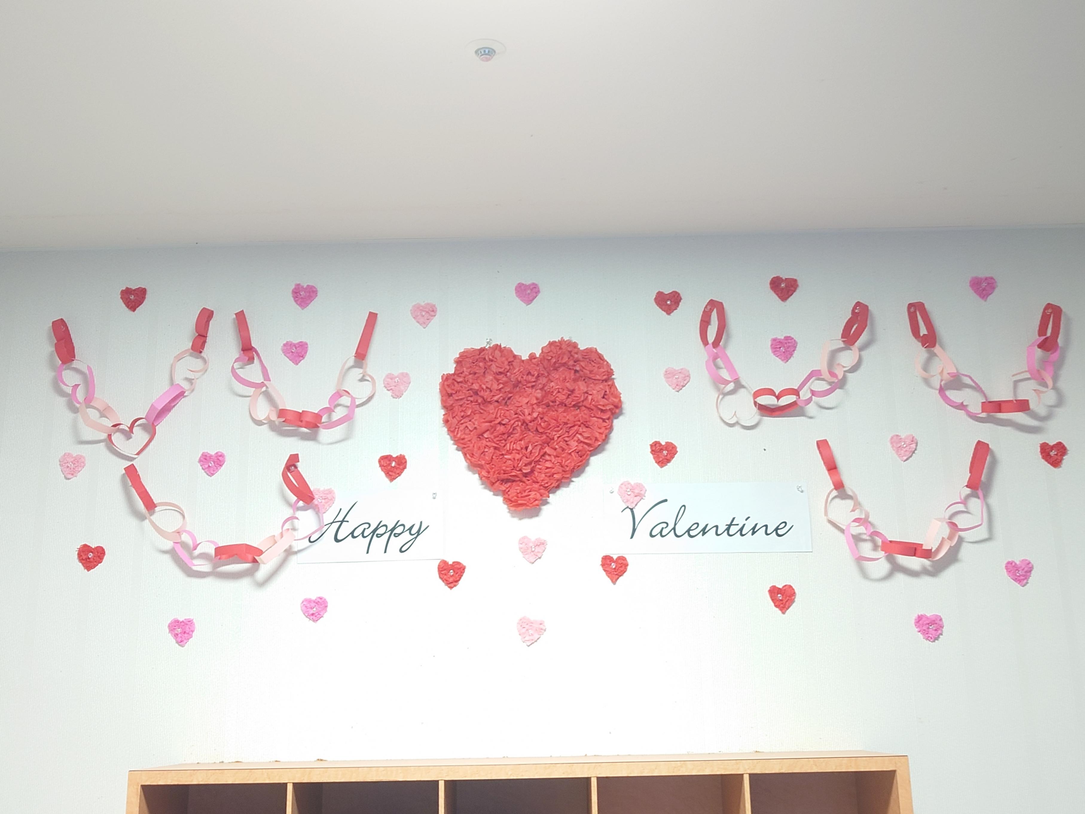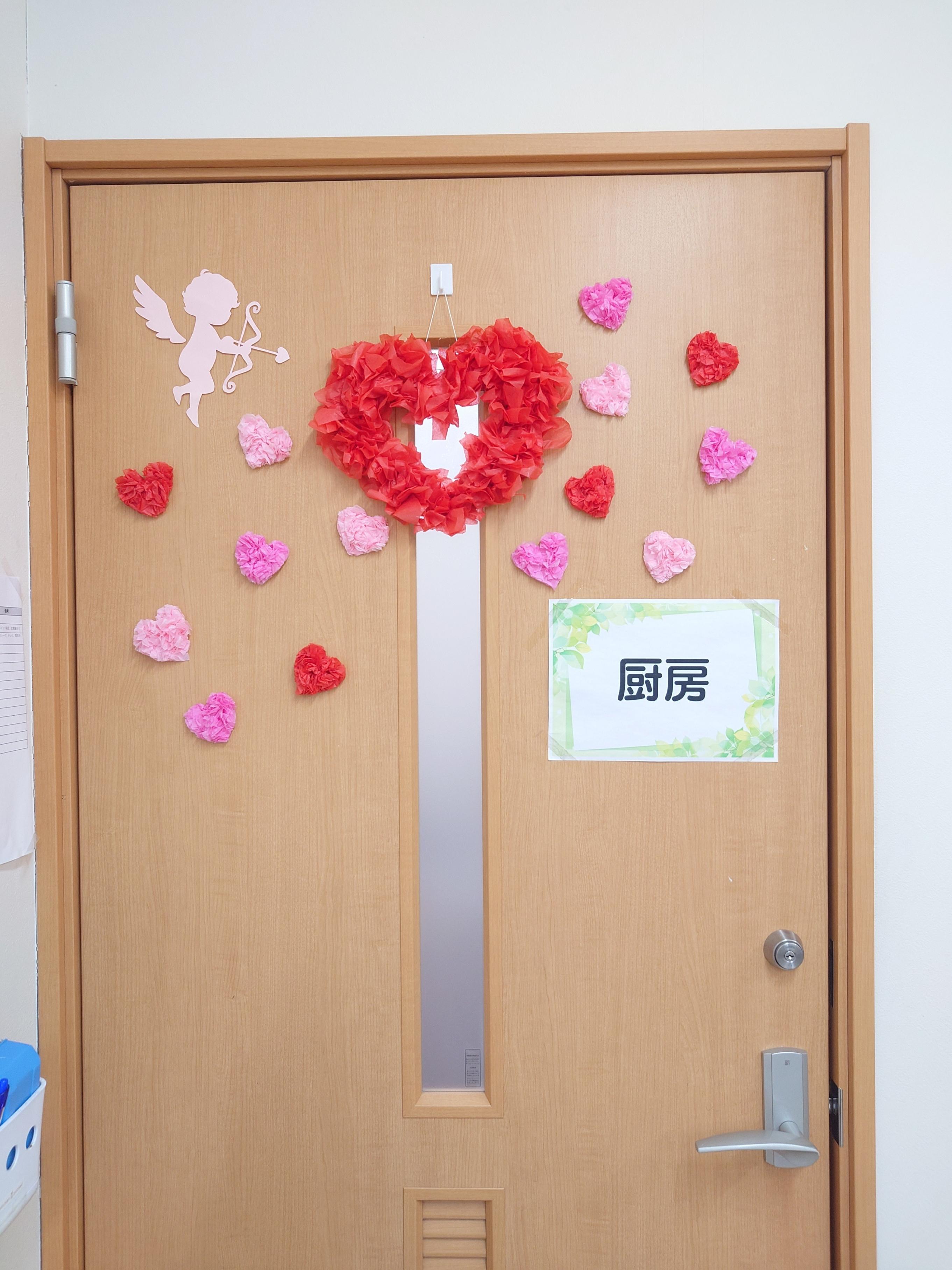 2月はバレンタインということで、玄関と厨房のドアをバレンタイン仕様に 飾りつけしてみました~ ハートをいっぱい散らしてみました キューピッドを色画用紙で切り抜いたのもポイントです^^ ![]() 玄関もハートをちりばめて、ハートの鎖を作ってみました~ ![]() 今日は誕生日会も行いましたので、それについては後日書いていきたいと思います! 事務 |